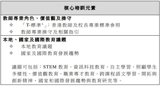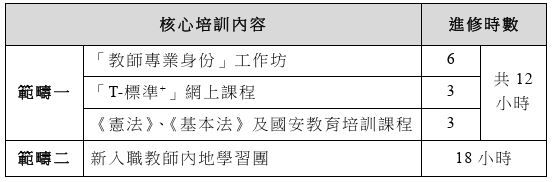 在職教師須於每三年 150小時的持續專業發展周期中,劃出不少於 30小時參與有關「教師專業角色、價值觀及操守」及「本地、國家及國際教育議題」兩大範疇的核心培訓,其中,每範疇須最少佔6小時。