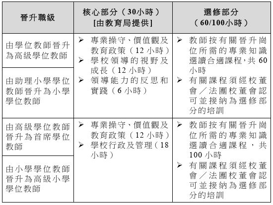所有資助學校教師必須達到載於《資助則例》的有關要求,並經校董會/法團校董會認可及審批修讀的培訓課程,方能符合晉升更高職級的資格。